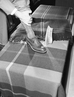Sharkskin shoe. Close up of the shoe, the man wearing the shoe is pulling up the bottom of his pants.