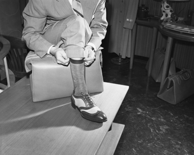Calf & Nylon shoe. The man wearing the shoe is pulling up the bottom of his pants.