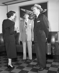 For a trip to other parts or just a trip downtown to the office, these suits go with the proper look for spring. The lightweight finished worsted is in a brown sheperd check. Fabric for the dark blue tropical worsted was woven in England from Australian wool. The two men wearing the suits stand beside each other. The men are also wearing hats. A woman stands to the left of them.