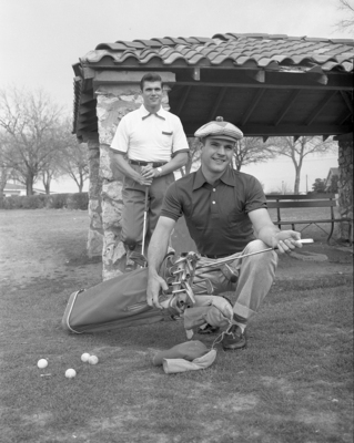 Polo shirts take to lounging or active sports equally well. Here are a white shirt piped in red and worn with light blue slacks and a navy blue shirt with abbreviated sleeves topping gray flannel slacks. There are two men wearing the fashion. One man is standing and holding a golf club, the other man is kneeling and holding a golf bag with clubs in it.