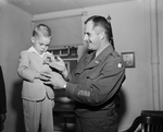 David Michael (Mike) Walker, Three and half, receives the Bronze Star Medal awarded posthumously to his father, first Lieutenant Thomas S. Walker of Fort Worth, from Captain Thomas P. Griffith, ORC instructor, at the ORC Armory in Liberator Village. Mike's father was killed in action in Korea. Military older man and little boy in a tuxedo.