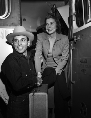 One of the honored guests for Texas Christain's University (TCU) Ranch Week activities, Miss Nina Pruter of Southern Methodist University (SMU), was met on her arrival by Bill Smith, parade chairman and member of the TCU Chamber of Commerce, sponsors of Ranch Week.
