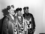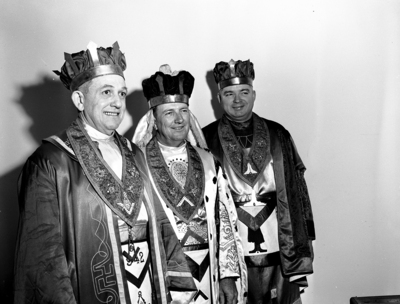 Three members of the 64th Masonic District Degree Team which will confer a Master Mason's Degree at observance of Washington's Birthday in Will Rogers Memorial Auditorium. the members, left to right, are A. Y. Taylor, senior deacon, Tarrant Lodge 942; T. J. Holloway, worshipful master, Cooke-Peavey Lodge 1162, and S. W. Beck, senior warden, Tarrant Lodge 942. Pictured are three men dressed in Freemason uniforms.
