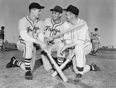 Outfielder Don Ford, left, and Catcher George Petrovich, center, both sophomores talk over Texas Christian University baseball prospects with returning outfield regular Bill Barnes in drill. Published in Fort Worth Star-Telegram evening edition, February 21, 1952.