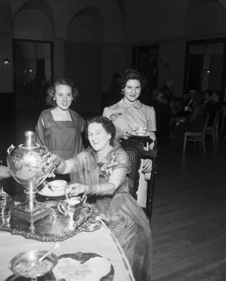Mrs. Earle C. Wilkes, regent of Mary Isham Keith chapter, Daughters of the Revolution (DAR), pours tea for Misses Betty Waddle, left and Marcia Cleveland, senior and junior winners, respectively, in the recent Girl Homemakers' Group contest sponsored by the chapter. Their dresses will be entered in a state contest March 10 to 13 in Waco.
