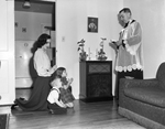 Asking God's blessing on a new home is Reverend Philip O'Regan, Saint Mary's Catholic Church pastor. Occupants of the home, Mrs. T. D. Ward and children, Wayne and Nancy, of 2728 Frazier, kneel as Father O'Regan carries out the ancient biblical rite, which is being revived. A man standing up holding a open book wearing a pastoral robe. A woman on her knees wearing a blouse and skirt. Two children; boy and girl.