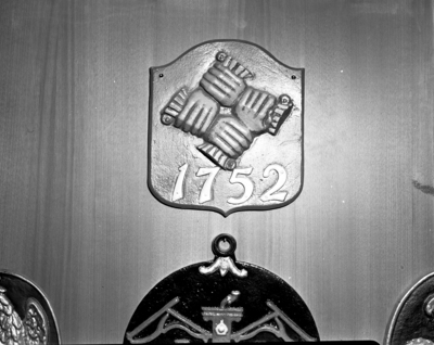 This is a facsimile of the four clasped hands which served as the fire-mark of Benjamin Franklin's fire fighting brigade in Philadelphia and preceded his organization, in 1752, of this country's first successful insurance firm.