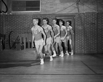 These five Poly players, members of the 1952 4A-3 basketball championship team, will start against Dallas Sunset in the opening game of the bi-district playoff series. Left to right, they are Don Bice, Bill Estill, Jimmy McCulloch, Johny Betts and Richard O'Neal. Published in Fort Worth Star-Telegram evening edition, February 20, 1952.