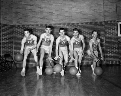 These Poly regulars start quest for state basketball title in Austin. Left to right, Richard O'Neal, Johnny Betts, Jimmy McCulloch, Bill Estill and Don Bice. They will play Sam Houston. Published in Fort Worth Star-Telegram evening edition, February 20, 1952.