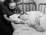 Little Raenella Allee, hospitalized since November with a so-far incurable illness, happily awaits a birthday party Sunday while her mother assures her there'll be 14 candles on her cake. Mrs. Allee's spirits stay high, despite nursing herself and two sons through bulbar polio three years ago and Raenella's condition now.