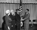 Charles Chapman, adjutant of Panther City Post 2544, Veterans of Foreign Wars, presents Principal G. C. Holder of Azle High School with an American flag on behalf of the post and its auxiliaries. Mrs. John R. Jameson, left, is auxiliary patriotic instructor and Mrs. Pearl Bilbrey is Americanism chairman.