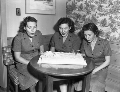 Three of the 40 Girl Scout leaders who celebrated Girl Scouting's 40th birthday by giving a pint of blood each to the North Texas National Defense Blood Center blew out the candles on a birthday cake before the blood withdrawals began. Left to right are Mrs. W. K. Manning of 209 Tinker, Lois McKenzie of 3819 Yucca and Samuel H. Cox of 5400 Andrea Ct. Three woman sitting down around a table with a square cake in front of them.