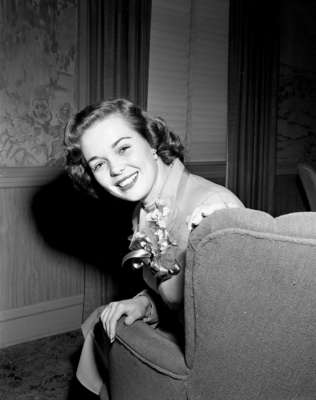 Nancy Gates, Mardi Gras co-queen. A woman sitting in a sofa chair smiling.