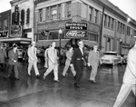 Novices Moslah Potentate Roscoe Carnrike's divan passes. Men wearing suits and hats walking through the streets.