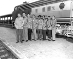 Texas Golden Gloves representatives in the Tournament of Champions at Chicago pose before boarding their train. Left to right, and heavyweight to flyweight, are Campbell Woodman, Alphonso Merino, Roy Harris, James Fowler, Pete Perez, Raymond Riojas, Henry Miramontes, and Pat McCarthy. Published in Fort Worth Star-Telegram morning edition February 24, 1952.