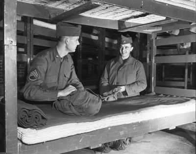 In photo at right, Sargeant Bert J. Gastl, left, and Corporal Clarence Peters, right, unpack and make up bunks for the night. Two men having a conversation in military uniform.