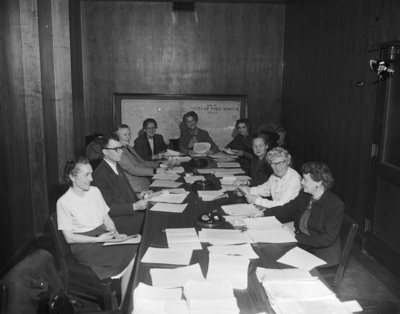 Brief Breather - Nine of the Star-Telegram's Scholastic Writing Awards judges pause for a moments rest as they go through the final papers in the regional judging. Pictured, left to right, are Mrs. Thomas Yates, Karl Snyder, Mrs. Beeman Fisher, Miss Dollie Glover, Miss Mary Hope Westbrook, Mrs. Olive Whitten, Miss Lorraine Sherley, Mrs. Artemisia B. Bryson, and Miss Mabel Major. Judges not pictured include William Baker, Mrs. A. A. Averitte, Mrs. Rose Lisenby, Mrs. L. R. Elliott, Carl Sutton and Dr. Jessie Lucke. Regional winners, to be announced later, will be sent to New York for competition in the national judging by Scholastic Magazines' award jury.