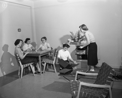 In the Kappa Theta Pi ramp in Chilton Hall, bridge and music are enjoyed, left to right, by Nancy Manire of Roanoke; Colleen Holmes of Quanah; Evelyn Cleveland of Mineral Wells; Barbara Thorpe of Fort Worth and Nancy Whitney of Big Spring. Published in Fort Worth Star-Telegram morning edition, March 30, 1952.