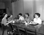 Five Fort Worth co-eds get together for a chat at luncheon in the cafeteria. Left to right are Jean Straiton, Betty Thomason, Carol Stallcup, Betty Dell and Ann Castles. Published in Fort Worth Star-Telegram morning edition, March 30, 1952.