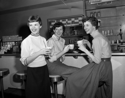 Between class refreshment is enjoyed in the snack bar by, left to right Madie Echols, Margaret McReary and Ernie Martin, all of Fort Worth and all junior journalism majors. Published in Fort Worth Star-Telegram morning edition, March 30, 1952.