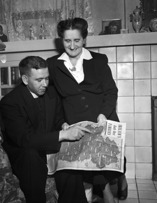 The map of Ireland claimed the attention of Mrs. Terry Finn, 1651 Westmoreland, a native of County Mayo, and her Dublin-reared nephew, Reverend John McGovern, visiting here, on the day before St. Patrick's Day. Published in Fort Worth Star-Telegram morning edition March 17, 1950.