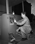 Grand opening - George Kendall of 1201 Orange, chief custodian of the North Texas National Defense Blood Center, puts the finishinig touches to the center's sidewalk booth. Located at W. 7th St. and Throckmorton, the booth will open Wednesday to recruit blood donors for the center.