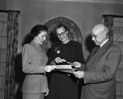 Light house gets new home - Mrs. Jon Knox Rhodes, left, board chairman of the Light House for the Blind, looks on as Guy Prince, right, trust officer for the Mrs. Etta O. Newby estate, as Miss Faye Ryan, owner of the Tom Bailey home, 912 W. Broadway, exchange a check and deed to turn the old home over to the light House for the Blind.