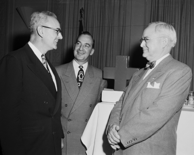 Red Cross Kickoff - Francis M. Hawk, center, chairman of education and promotion for the national Red Cross blood program, was main speaker Wednesday when the American Red Cross officially opened its Tarrant County drive for funds. Y. E. Juge, left, division chairman, discuss the $275,500 goal with Hawk.