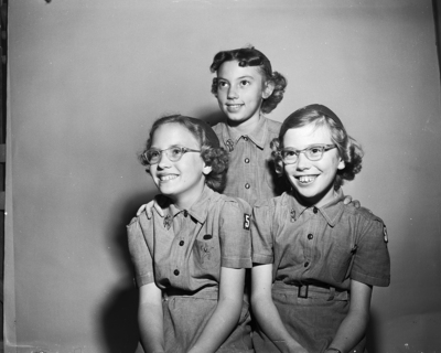 Glad to have helped their Brownie Troop 53 become the first with 100 percent membership in the Children's Museum are, left to right, Sharon Walters, Jane Thomas and Aneta Lewis. Ther are daughters of Mr. and Mrs. W. A. Walters of 511 Frontier, Mr. and Mrs. R. B. Thomas of 411 Frontier and Mr. and Mrs. Aubrey of 601 Worthview.