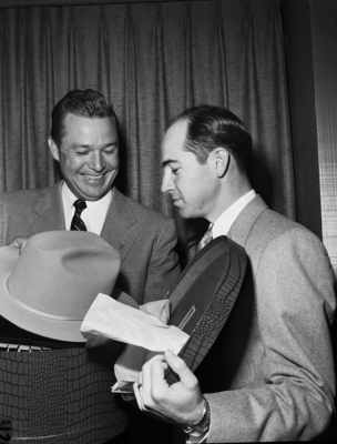Texas Style - Lloyd J. Weaver, right, president of the Fort Worth Jaycees, presents a Texas hat to Lee Price Jr. of Atlanta, Georgia, president of the U.S. Junior Chamber of Commerce. Price spoke Wednesday night to Fort Worth Jaycees in Hotel Texas as part of dour-day Texas tour.
