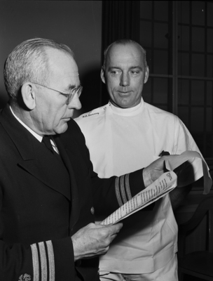 Top Hospital Aid - Dr. T. H. Ainsworth left, chief of the neuro-psychiatric service at the U.S. Public Service Hospital, reads to Russel L. Gosney the settlement nominating him as the hospital's candidate in a nationwide contest among mental hospitals to select the psychiatric aide of the year.