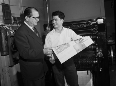 All Set - John Kemmerer, left, co-chairman of the arrangements committee for Public School Week, commends Jesse Gonzales for work done in Technical High School's print shop. The Department will be open when visitors call at Fort Worth schools March 2-8.