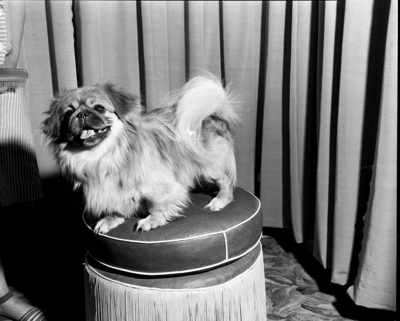 Foo-Chang of See Vee, red Pekingese owned by Mrs. Georgia Sevier, 909 Judd, have been entered in the Fort Worth Kennel Club's show. Dog laying on all fours with tongue out.