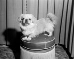 Jai-Mon-V. U. of See Vee, fawn and white, owned by Mrs. Georgia Sevier, 909 Judd, have been entered in the Fort Worth Kennel Club's show. Dog standing on all fours on a stool. Mouth is closed.