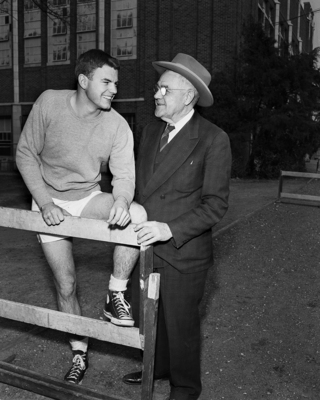 Bob Wilson, left, state Quarter mile champion, chat with Paschal Track Coach C. W. Berry. Wilson, all-city in both football and basketball, will compete in the Southwestern Recreation meet. Published in Fort Worth Star-Telegram morning edition February 28, 1952.