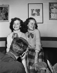 Distinctive - These identical twins, Glenda Sue, left, and Linda Lue Mathis, celebrate their 16th birthday Friday. The head in the foreground belongs to George Scrymgeour, a classmate at J. P. Elder Junior High, who still is trying to learn which is which.