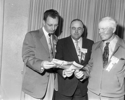 Two hundred Midwest farm people were in Fort Worth for a quick visit. Looking over a brochure telling of the city's attractions were, left to right, Mel Hannsen, Radio Station WOW farm editor, tour director, Omaha; A. J. Fleischman of Tekamah, Nebraska, and Lawrence Sandall of Bassett, Nebraska, who homesteaded in the Nebraska Sand Hills in 1894.