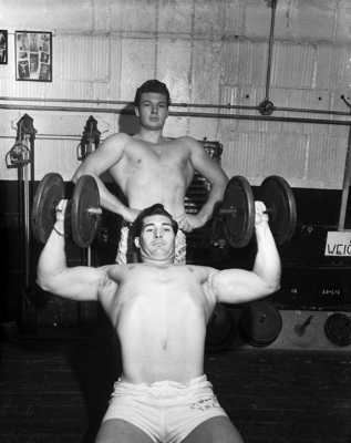 Muscle Men - Bill Derrick, foreground, and Lindel Harvey will represent Fort Worth in the "Mr. South Western" contest at Dallas Saturday night. Two years ago Derrick was anmed "Mr. Dallas" in a similar competition. Derrick also will particiapte as a heavyweight weighlifter. Both train at the YMCA here.