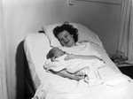 Welcome - Mrs. Roland Paul Cyr, who has been a patient in City-County Hospital's polio ward since November 5, greets her baby, born Thursday night. The boy, weighing 9 pounds and 8 ounces, was the first born in the polio ward since October 1950. Mr. and Mrs, Cye live at 2201 Gould.