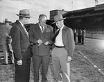 Comparing notes during recess of Texas Christian University grid clinic are, left to right, Coaches Harold Dement of Galena Park, Lawrence Priddy of Gainesville and Raymond Berry of Paris. Published in Fort Worth Star-Telegram morning edition March 1, 1952.