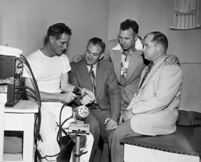 Purple Trainer Elmer Brown, left, gives demonstration to Coaches Cooper Robbins of Breckenridge, Edward L. Adams of Carswell Air Base, and Dan Campbell of Poly. Published in Fort Worth Star-Telegram morning edition, March 1, 1952.