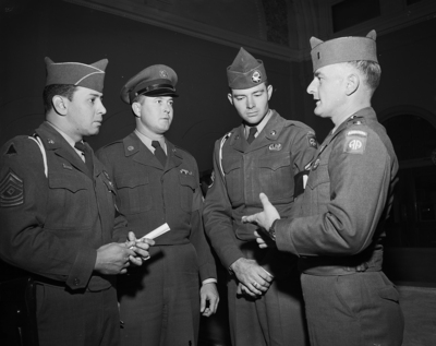 Lieutenant Hervey E. Keator, right, of the 82nd Airborne Division, briefs two 82nd military police from Fort Bragg, N. C., and a Carswell Air Force Base air policeman on methods of keeping the peace in town Saturday night between the 1,000 visiting paratroopers and Carswell airmen. Left to right are Sergents C. J. Lopez, Fort Bragg; Jesse A. Wallace, Carswell, and Estill Williamson, Fort Bragg.