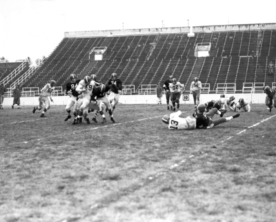 Five Purple-Shirts move in to bring down Ray McKown after a short gain in the intra-squad game that wound up Texas Christian's spring drills. Tacklers include Wayne Martin (84), Ronald Fraley (16), and R. C. Harris (74). Published in Fort Worth Star-Telegram morning edition March 2, 1952.