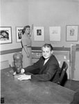 Award winners Evaline Sellors next to Dickson Reeder's etching "Insect"; Dickson Reeder beside Evaline Sellors' "Head" sculpture.