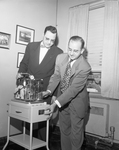 Louis Luskey, B'nai B'rith Lodge president, puts plaque on a suction machine the lodge gave City-County Hospital Monday. Looking on is the hospital's administrator, Lowell Hudson.