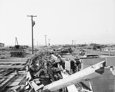 This is a view of the mass of debris left when 30 masonry car ports at the Ridgeway Manor, east of the Ridglea golf course, were flattened by a light twister. A dock and ocean around the dock. There is boats all around the area.