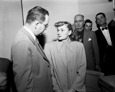 Defense Attorney Frank Massey, left, and Mrs. Doris Faye Barber are shown as they talked before preliminaries got under way in Criminal District Court in the murder trial of Mrs. Barber's husband, Robert Barber. The case was continued.