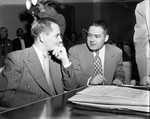Richard Earl Johnson of 1316 Eagle Drive, a lawyer on leave from the Army, has volunteered to help with the defense of Robert Barber, charged with the murder of Detective H. E. Cleveland. Johnson is shown here, right, with Barber before the case was continued in Criminal District Court.
