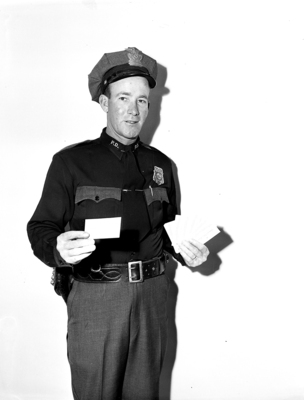 Police began selling tickets, not giving them. T. W. Curtis holds samples for the annual policemen's ball to be held at Lake Worth Casino.