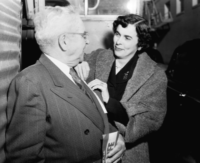 E. O. Wood, Odd Fellows deputy grand master, and Mrs. Gladys Houston, a Rebekah, prepare to board a bus for a goodwill trip to Witchita Falls. A man and woman dressing formally looking at eachother.